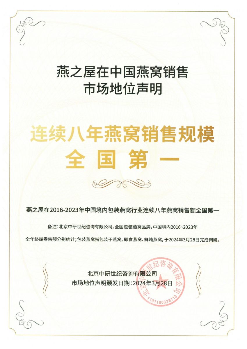 再顯實力!燕之屋獲沙利文市場地位確認(rèn)證書,燕窩工廠全球規(guī)模第一